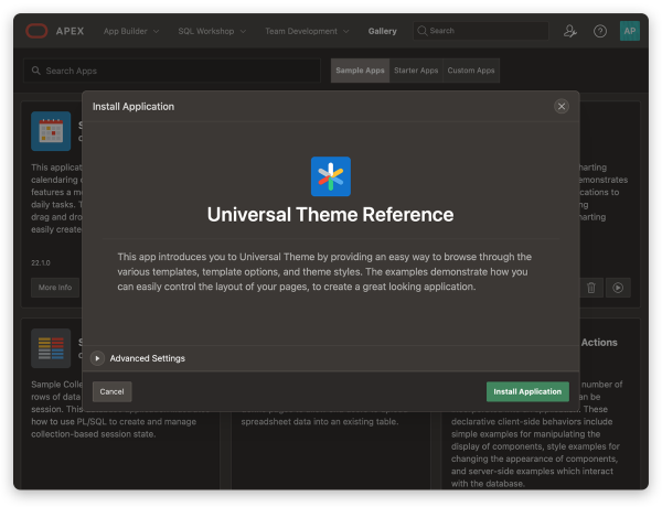 Now you can install starter apps and sample apps without leaving APEX. Within seconds, you can select the app you want and install it from the updated App Gallery.