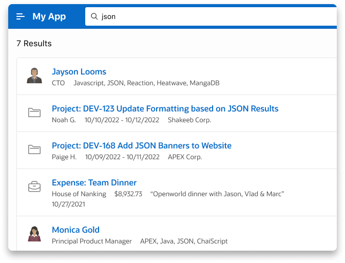 Search Configurations also support tables or queries with Oracle Text indexes already created, enabling linguistic and fuzzy search capabilities. You can also define icons, links, badges, custom row templates, sort behavior, and more!